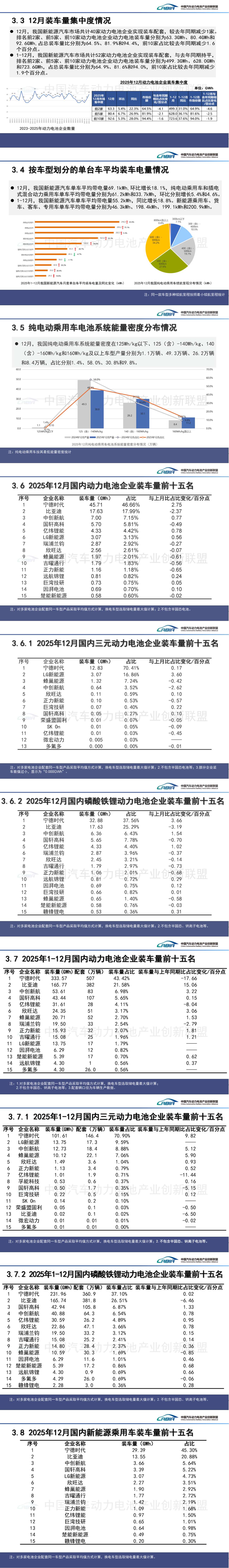 摘要:1月16日,中国汽车动力电池产业创新联盟发布发布2025年12月动力电池月度信息。12月,国内动力电池装车量98.1GWh,环比增长4.9%,同比增长35.1%。其中三元电池装车量18.2GWh,占总装车量18.6%,环比增长0.2%,同比增长40.5%;磷酸铁锂电池装车量79.8GWh,占总装车量81.3%,环比增长5.9%,同比增长33.7%。