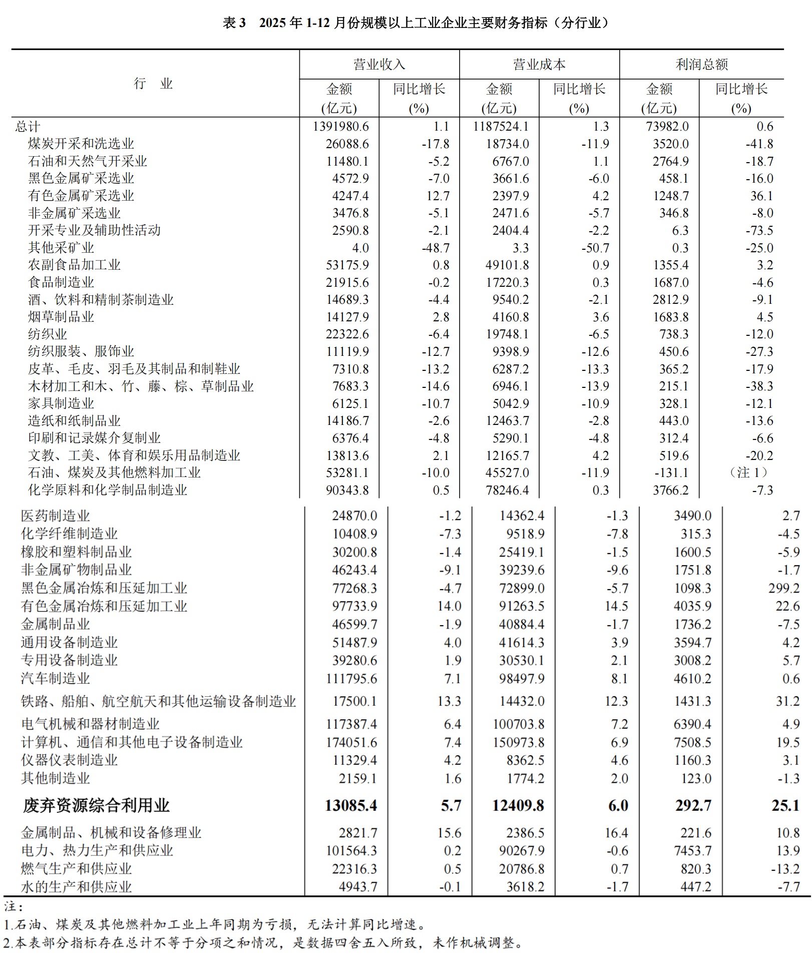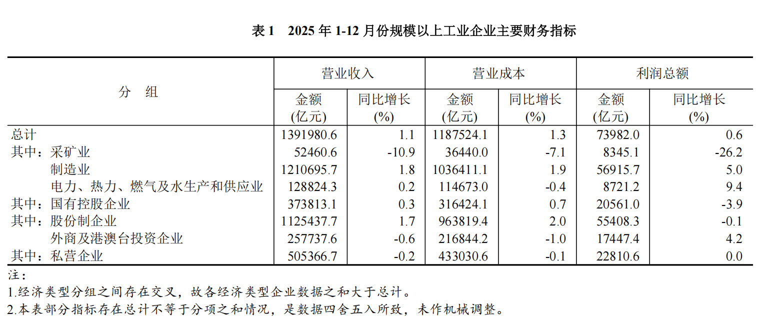 2025年,全国规模以上工业企业实现利润总额73982.0亿元,比上年增长0.6%(按可比口径计算,详见附注二)。