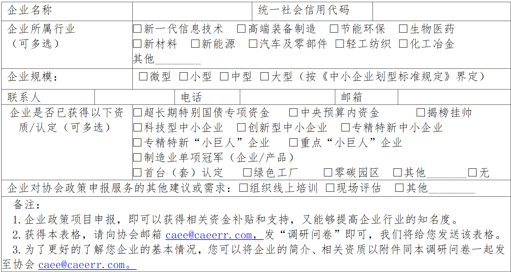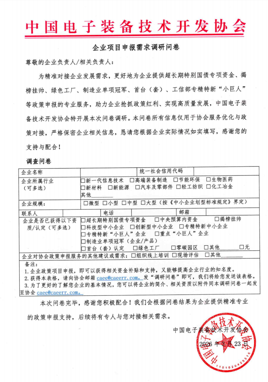 为精准对接企业发展需求,更好地为企业提供超长期特别国债专项资金、揭榜挂帅、绿色工厂、制造业单项冠军、首台(套)、工信部专精特新“小巨人”等政策申报的专业服务,助力企业抢抓政策红利、实现高质量发展,中国电子装备技术开发协会特开展本次问卷调研。本问卷所有信息仅用于协会服务优化与政策对接,严格保密企业相关信息,恳请您根据企业实际情况如实填写,感谢您的支持与配合!