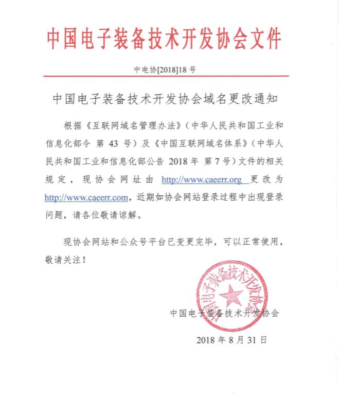 根据《互联网域名管理办法》(中华人民共和国工业和信息化部令第43号)及《中国互联网域名体系》(中华人民共和国工业和信息化部公告 2018年第7号)文件的相关规定,现协会网址由http://www.caeerr.org更改为http://www.caeerr.com,近期如协会网站登录过程中出现登录问题,请各位敬请谅解。