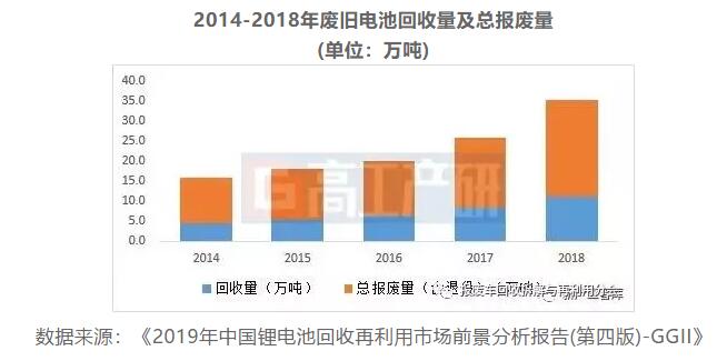 GGII统计2018年动力电池的总报废量达7.4万吨,数码电池总报废量达16.7万吨。然而目前市场上动力电池的回收量远低于预期,2018年市场动力电池回收量5472吨,只占报废动力电池总量的7.4%;数码电池的回收量10.63万吨,占总报废量的63.6%左右,相比较整个锂电池报废市场,回收量预期仍没有达到。
