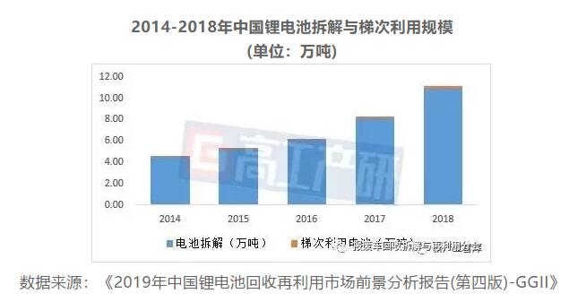 GGII调研显示,2018年动力电池回收总量中用于梯次利用的电池量为2460吨,总回收拆解的电池量为10.93万吨,电池回收领域尤其是动力电池回收领域,用于梯次利用的规模远低于回收拆解的规模。