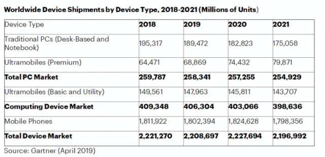 Gartner研究主管兰吉特·阿特瓦尔(Ranjit Atwal)表示:“个人电脑市场连续第八年处于停滞状态。2019年个人电脑出货量预计将达到2.58亿台,较2018年下降0.6%。其中传统PC出货量将下降3%,降至1.89亿台。”