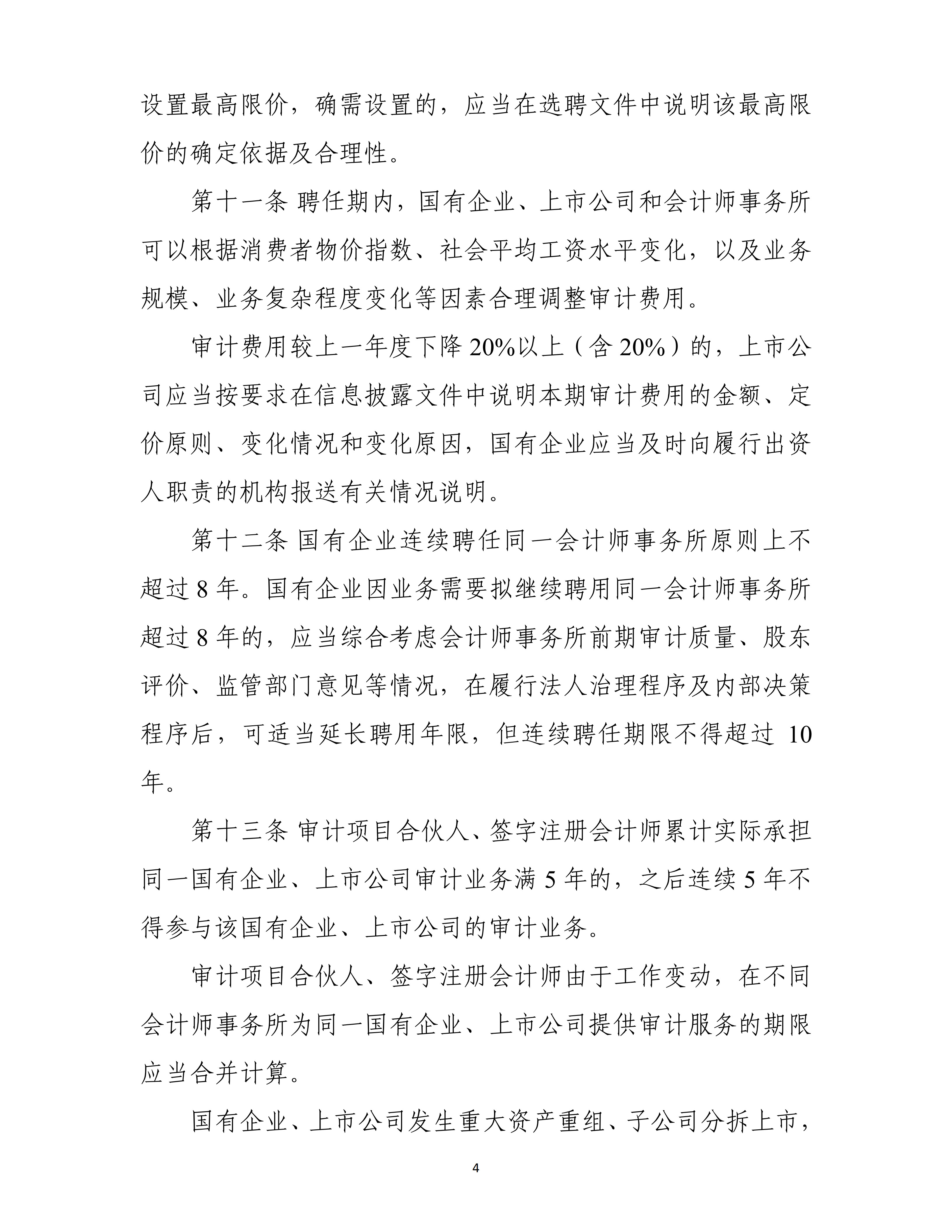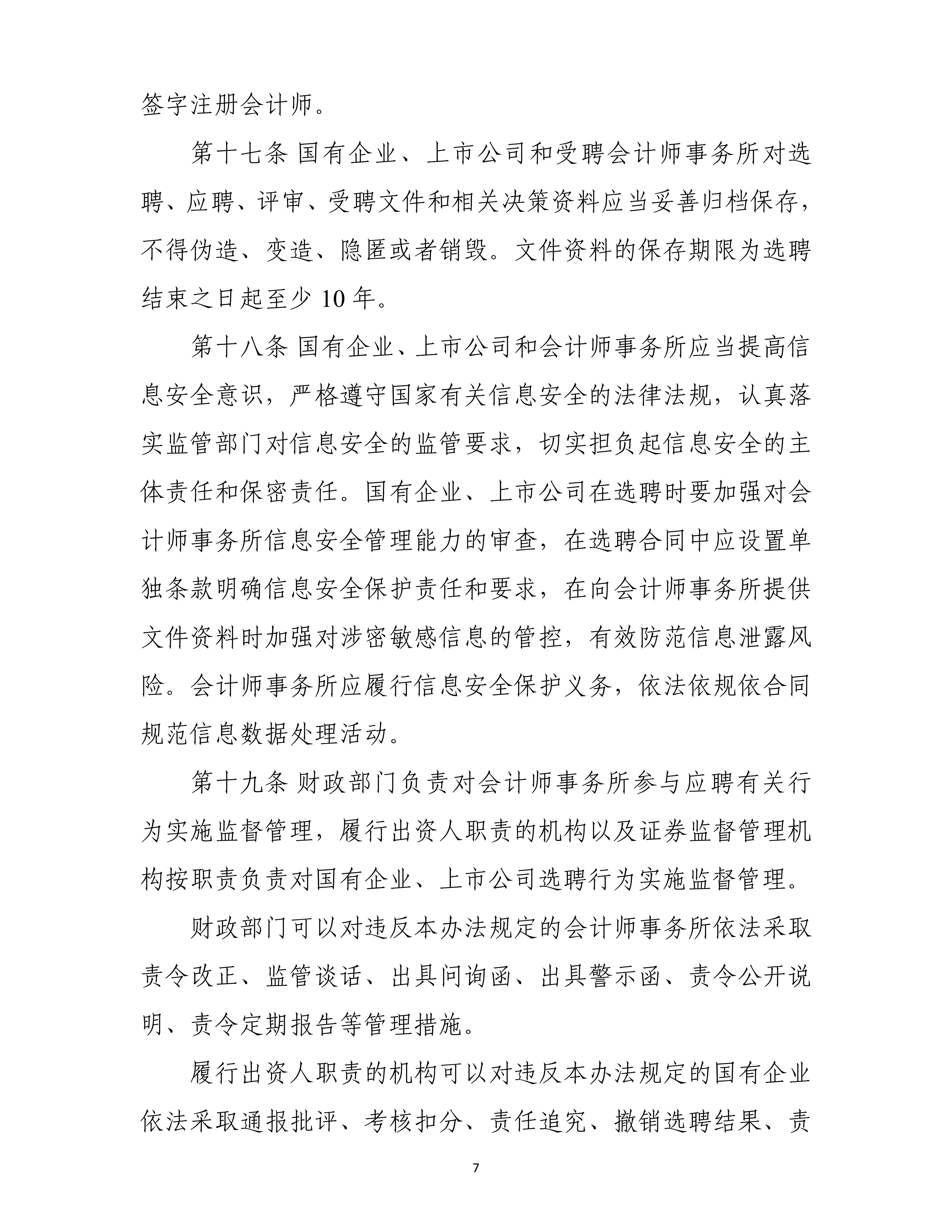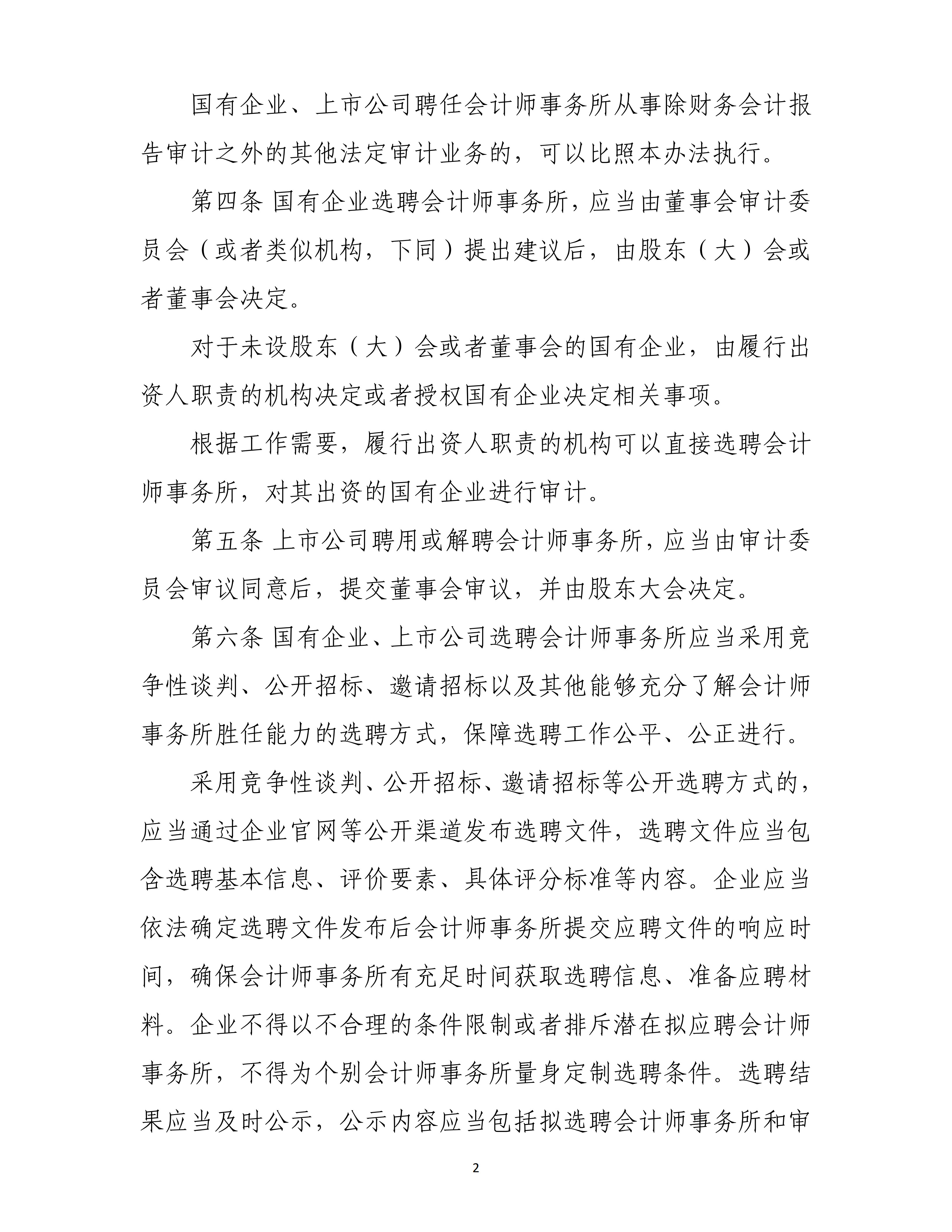 《选聘办法》指出,国有企业及其股票在境内证券交易所上市交易的股份有限公司,应加快完善选聘会计师事务所相关制度,规范选聘会计师事务所行为。应当采用竞争性谈判、公开招标、邀请招标以及其他能够充分了解会计师事务所胜任能力的选聘方式,保障选聘工作公平、公正进行。同时,《选聘办法》对会计师事务所轮换、信息披露、审计委员会职责等重点事项作出规范,明确财政部门可以对违反本办法规定的会计师事务所依法采取责令改正、监管谈话、出具问询函、出具警示函、责令公开说明、责令定期报告等管理措施。