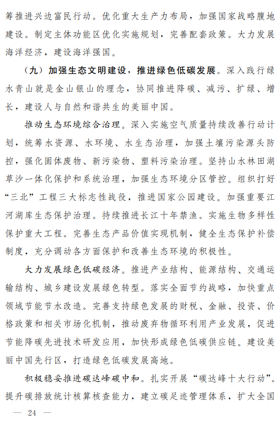 大力发展绿色低碳经济。推进产业结构、能源结构、交通运输结构、城乡建设发展绿色转型。落实全面节约战略,加快重点领域节能节水改造。完善支持绿色发展的财税、金融、投资、价格政策和相关市场化机制,推动废弃物循环利用产业发展,促进节能降碳先进技术研发应用,加快形成绿色低碳供应链。建设美丽中国先行区,打造绿色低碳发展高地。