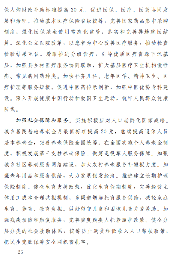 35. 居民医保人均财政补助标准提高30元。城乡居民基础养老金月最低标准提高20元。