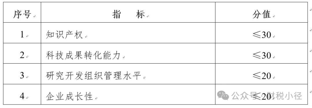 答:企业创新能力主要从知识产权、科技成果转化能力、研究开发组织管理水平、企业成长性等四项指标进行评价。各级指标均按整数打分,满分为100分,综合得分达到70分以上(不含70分)为符合认定要求。四项指标分值结构详见下表: