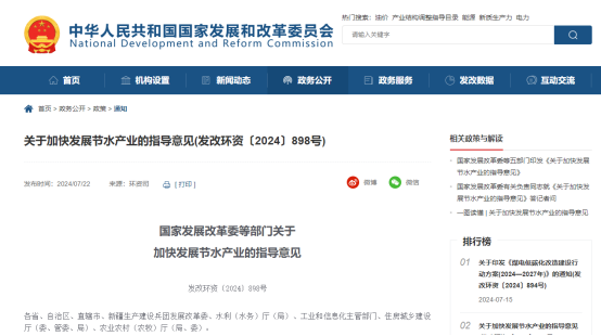 导读:近日,国家发展改革委、水利部、工业和信息化部、住房城乡建设部、农业农村部联合印发《关于加快发展节水产业的指导意见》,提出到2027年,节水产业规模达到万亿,培育形成一批“专精特新”小巨人企业,初步建立以企业为主体、市场为导向、创新为动力、产学研用相结合的节水产业发展格局。到2035年,培育一批百亿级龙头企业,节水技术工艺、产品装备制造和管理服务达到世界先进水平,节水型生产生活方式全面形成。