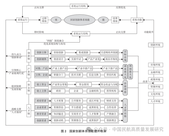 “四链”对国家创新体系的系统运行起到重要作用。分别在国家创新体系效能提升过程中占据不同地位,创新链作为系统运行的持久动力,反映了知识、技术在整个商业化过程中的流动、转化和价值实现情况,是促进创新驱动发展战略落实的现实手段,以满足市场需求为导向,在“创意 设计、实验中试、产品产业化、商品市场化”等环节中进行原始创新、集成创新以及引进吸收再创新。产业链是系统运行的引领核心,主要载体是企业和产品,通过上下游企业配套供需合作实现商业最大化和利润最大化,是上下关联、动态联结的组织结构。创新链与产业链有效衔接便于打通产业、技术通道,促进国家创新体系效能提升。资金链是系统运行的“发展资粮”,经过筹集、使用、收益和分配最终实现价值增值,同时也是创新链产业链有效衔接、延伸发展的重要保障。人才链是系统运行的战略支撑,人才强国战略强调人才是第一资源,通过打造服务于创新链、 产业链的高效人才供应链促进系统流畅运行,为国家创新体系创造智慧优势、奠定发展根基。