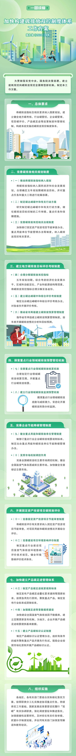 实施以强度控制为主、总量控制为辅的碳排放双控制度,建立碳达峰碳中和综合评价考核制度,加强重点领域和行业碳排放核算能力,健全重点用能和碳排放单位管理制度,开展固定资产投资项目碳排放评价,构建符合中国国情的产品碳足迹管理体系和产品碳标识认证制度,确保如期实现碳达峰目标。