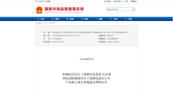 为深入推进电动自行车安全隐患全链条整治行动,保障电动自行车产品质量安全,现将加强电动自行车产品准入有关要求及行业规范管理工作措施公告如下: