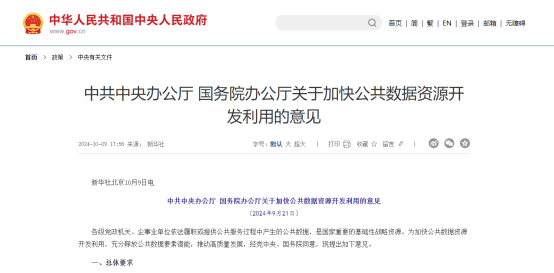 各级党政机关、企事业单位依法履职或提供公共服务过程中产生的公共数据,是国家重要的基础性战略资源。为加快公共数据资源开发利用,充分释放公共数据要素潜能,推动高质量发展,经党中央、国务院同意,现提出如下意见。