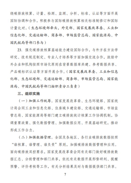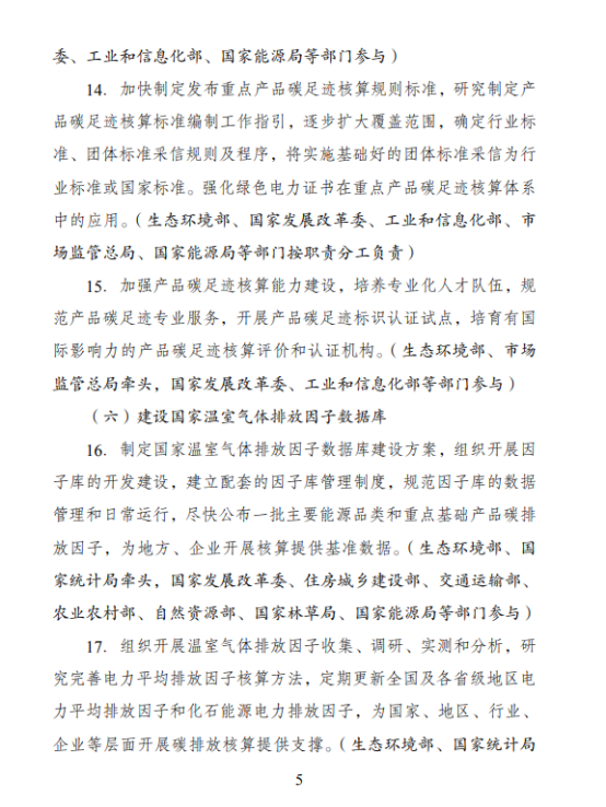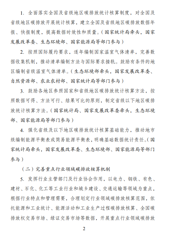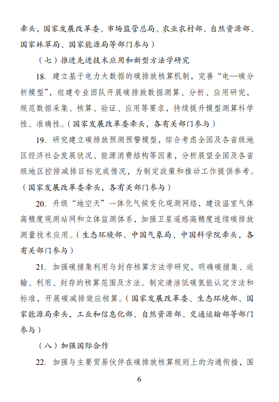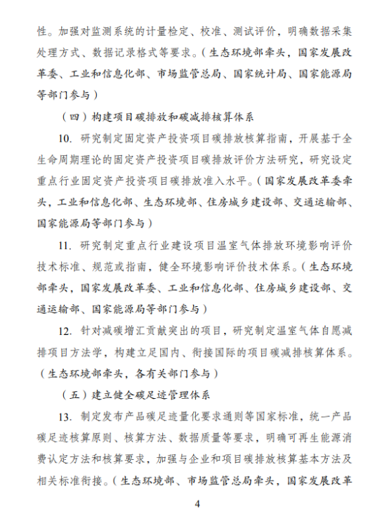 具体来说,包括健全区域碳排放统计核算制度,完善重点行业领域碳排放核算机制,健全企业碳排放核算方法,构建项目碳排放和碳减排核算体系,建立健全碳足迹管理体系,建设国家温室气体排放因子数据库,推进先进技术应用和新型方法学研究,加强国际合作等。