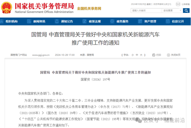 为深入贯彻落实党的二十大和二十届二中、三中全会精神,支持新能源汽车产业发展,更好发挥中央和国家机关示范引领作用,按照《党政机关公务用车管理办法》(中办发〔2017〕71号)、《新能源汽车产业发展规划(2021-2035年)》(国办发〔2020〕39号)、《关于促进汽车消费的若干措施》(发改就业〔2023〕1017号)、《“十四五”公共机构节约能源资源工作规划》(国管节能〔2021〕195号)等有关规定,现就做好中央和国家机关新能源汽车推广使用工作通知如下: