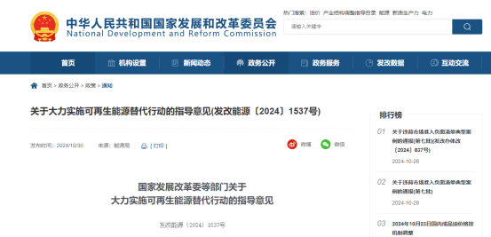 10月30日,国家发展改革委、工业和信息化部、住房城乡建设部、交通运输部、国家能源局、国家数据局联合印发《关于大力实施可再生能源替代行动的指导意见》(下称“指导意见”)