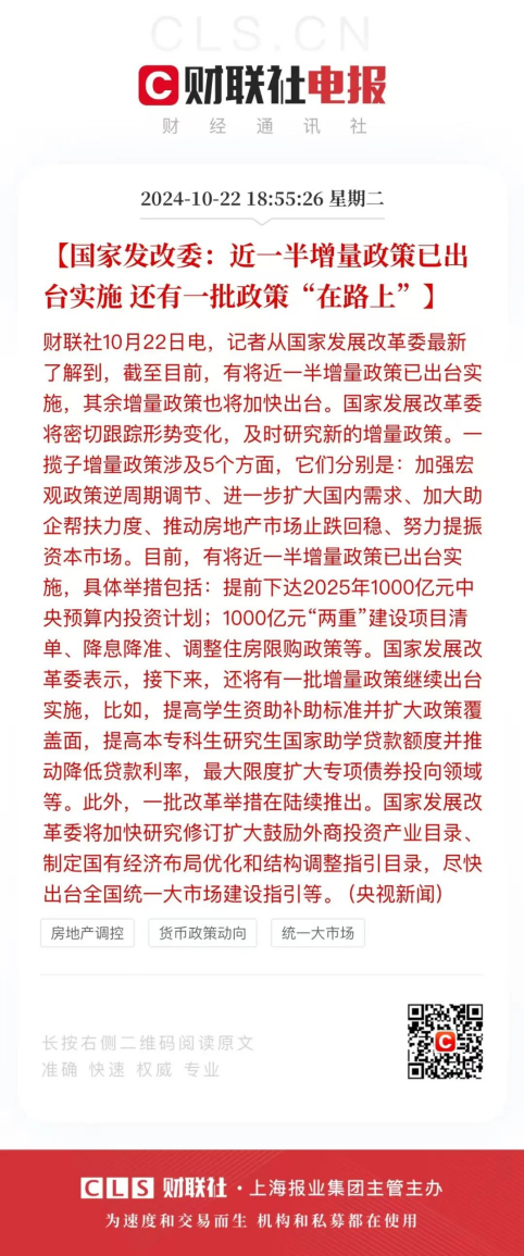据央视新闻从国家发展改革委最新了解到,截至目前,有将近一半增量政策已出台实施,其余增量政策也将加快出台。