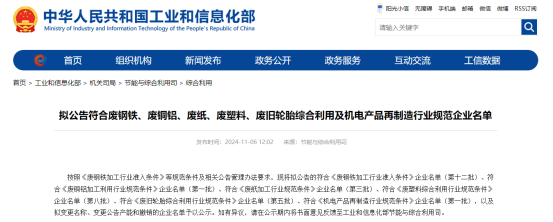 按照《废钢铁加工行业准入条件》等规范条件及相关公告管理办法要求,现将拟公告的符合《废钢铁加工行业准入条件》企业名单(第十二批)、符合《废铜铝加工利用行业规范条件》企业名单(第一批)、符合《废纸加工行业规范条件》企业名单(第三批)、符合《废塑料综合利用行业规范条件》企业名单(第八批)、符合《废旧轮胎综合利用行业规范条件》企业名单(第五批)、符合《机电产品再制造行业规范条件》企业名单(第一批),以及拟变更名称、变更公告产能和撤销的企业名单予以公示。如有异议,请在公示期内将书面意见反馈至工业和信息化部节能与综合利用司。