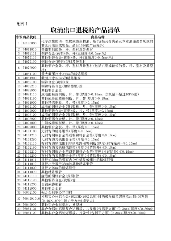一、取消铝材、铜材以及化学改性的动、植物或微生物油、脂等产品出口退税。具体产品清单见附件1。
