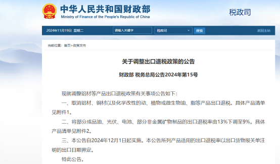 财政部、税务总局发布调整出口退税政策的公告。