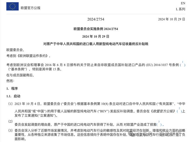 实际上,欧盟针对中国电动汽车产品征收关税的议题已持续超过一年。回溯至2023年9月13日,欧盟委员会主席乌苏拉·冯德莱恩(Ursula von der Leyen)宣布启动对中国大陆进口纯电动汽车(BEVs)的反补贴调查。随后,在2024年10月29日晚,欧盟委员会通过官方公告正式发布了对源自中华人民共和国的新型载人电动汽车实施最终反补贴税的条例(编号2024/2754),此举标志着欧盟委员会正式决定对中国电动汽车征收高额关税。根据最终的反补贴税清单,各相关企业税率如下:比亚迪集团为17.0%,吉利集团为18.8%,上汽集团为35.3%,特斯拉(上海)有限公司则为7.8%,而其他合作企业的税率为20.7%,所有未参与合作的公司则需面对35.3%的税率。