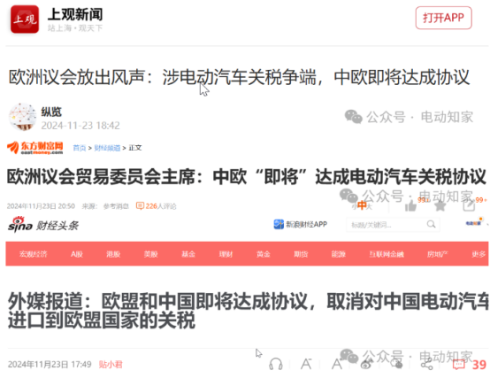 11月23日,根据众多新闻机构的报道,有消息称欧盟可能会取消对中国电动汽车征收的关税。上观新闻引用德国新闻电视频道网站的报道指出,欧洲议会透露出信息,中欧双方有望在电动汽车关税问题上达成协议。报道进一步提到,欧洲议会贸易委员会主席贝恩德·朗格表示,自特朗普成为美国总统后,欧盟需要对其竞争政策进行新的调整。他乐观地表示,在涉及中国电动汽车的关税争议上,双方有望达成和解。同时,新浪财经的头条也援引了外国媒体的报道,指出欧盟和中国正接近就取消中国电动汽车进口至欧盟国家的关税达成协议。东方财富网则参考相关消息称,欧洲议会贸易委员会主席表示中欧“接近”就电动汽车关税问题达成协议。