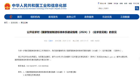 现公开征求社会各界意见,如有意见或建议,请于2025年1月1日前填写《征求意见反馈信息表》(附件2)发送至KJBZ@miit.gov.cn(邮件主题注明:国家智能制造标准体系建设指南征求意见反馈)。