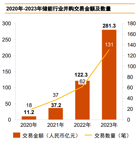 并购交易总体来看,受益于电力市场改革、政策支持项目经济性提升等多重利好因素,2023年储能产业链并购交易金额同期增长131%,交易数量同期增长111%。储能集成商和储能新型技术交易占比分别超过40%,以钠离子电池和液流电池为代表的新型储能技术因其与锂离子电池有一定的互补性,成为最受资本关注的赛道;集成赛道中侧重于工商业的储能集成商仍是资本重点看好的细分领域。