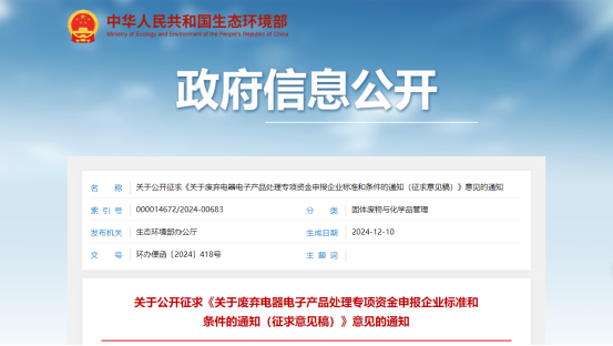 为贯彻落实《废弃电器电子产品处理专项资金管理办法》,促进废弃电器电子产品的妥善回收处理,我部会同财政部研究编制了《关于废弃电器电子产品处理专项资金申报企业标准和条件的通知(征求意见稿)》,现公开征求意见。征求意见稿及其编制说明可登录我部网站(https://www.mee.gov.cn/),在“意见征集”栏目或首页搜索栏输入本通知名称检索查阅。