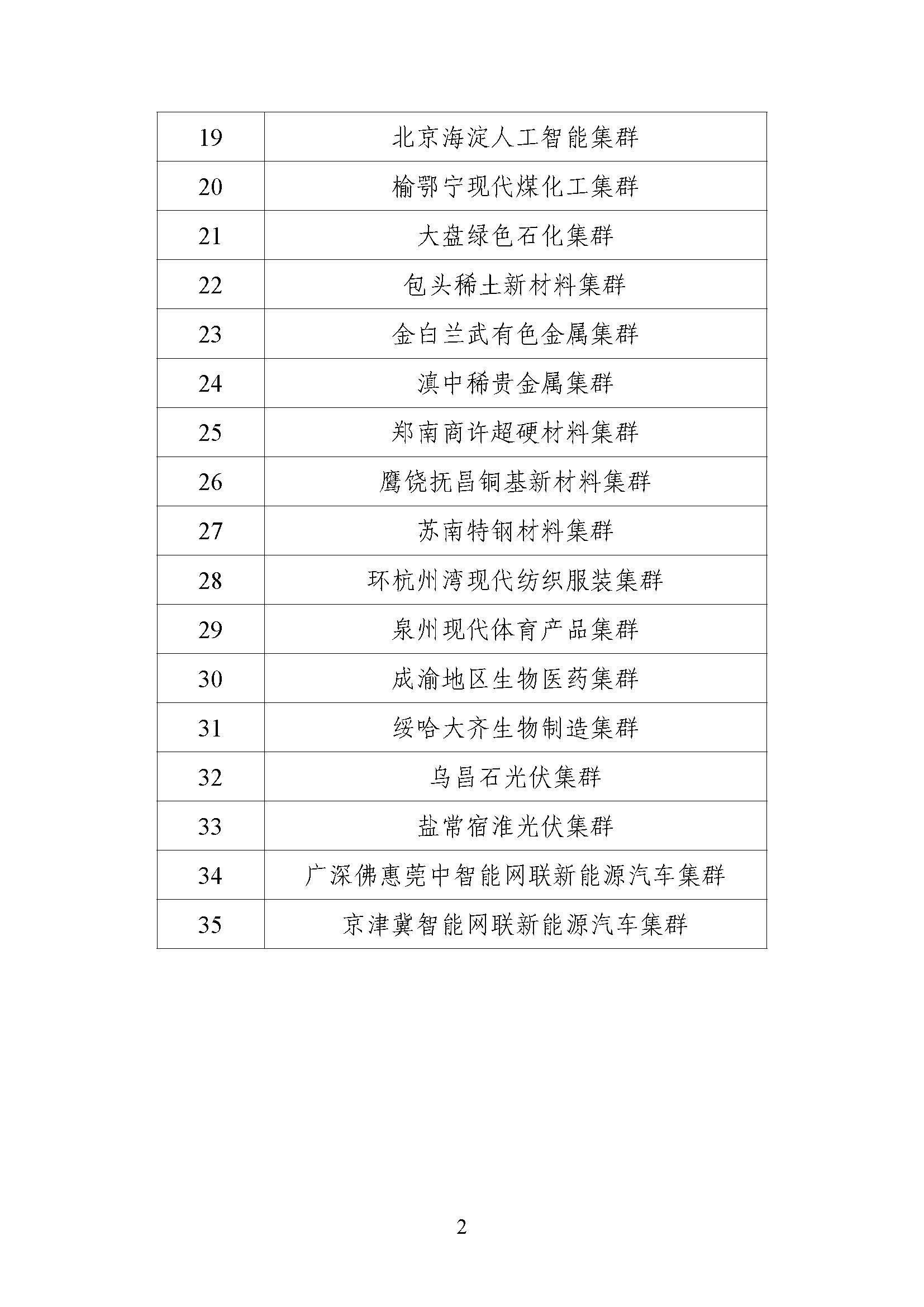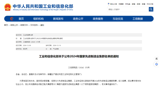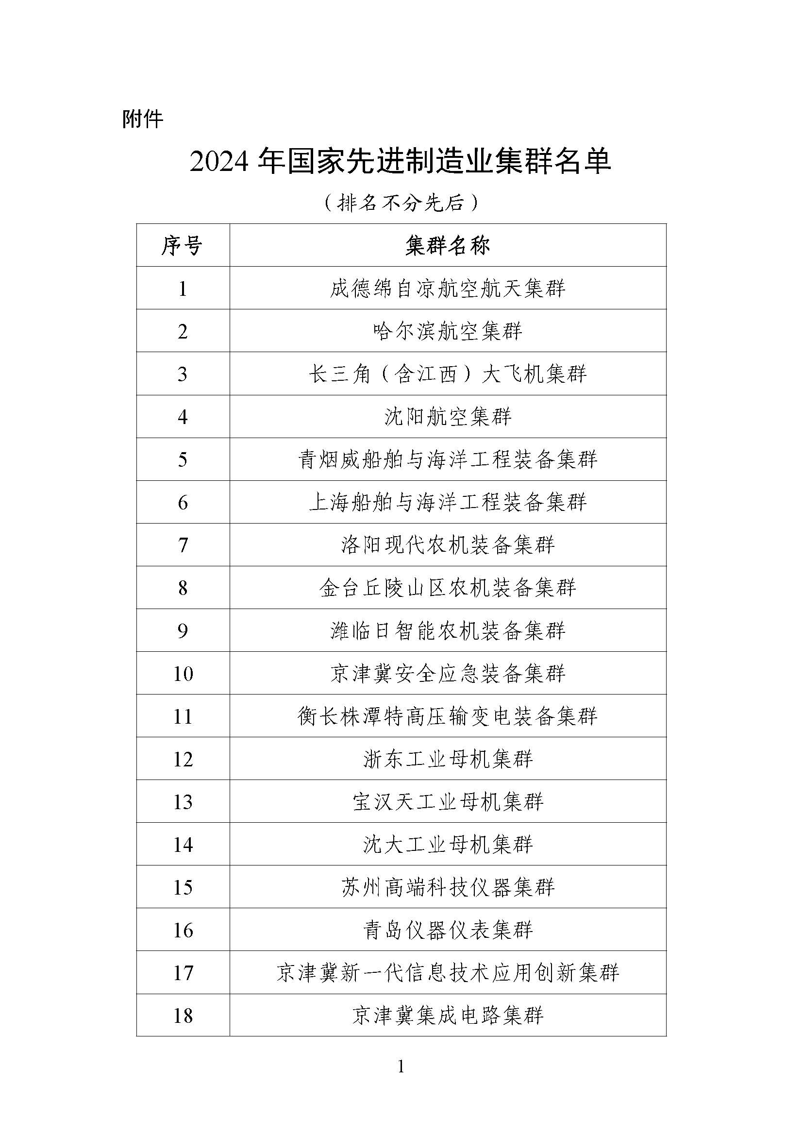 为贯彻落实党中央、国务院决策部署,培育壮大先进制造业集群,工业和信息化部组织开展2024年先进制造业集群竞赛。经小组赛、综合赛评审并向社会公示,现公布成德绵自凉航空航天集群等35个集群为国家先进制造业集群(以下简称国家级集群),有关事项通知如下。