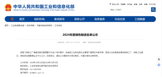12月16日,工业和信息化部官网发布2024年度绿色制造名单公示,公示名单有绿色工厂1383家、绿色工业园区123家、绿色供应链管理企业127家。