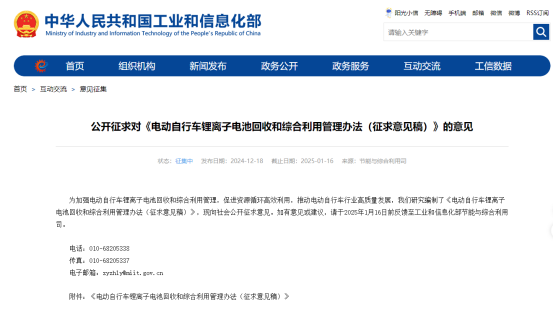 为加强电动自行车锂离子电池回收和综合利用管理,促进资源循环高效利用,推动电动自行车行业高质量发展,我们研究编制了《电动自行车锂离子电池回收和综合利用管理办法(征求意见稿)》,现向社会公开征求意见。如有意见或建议,请于2025年1月16日前反馈至工业和信息化部节能与综合利用司。