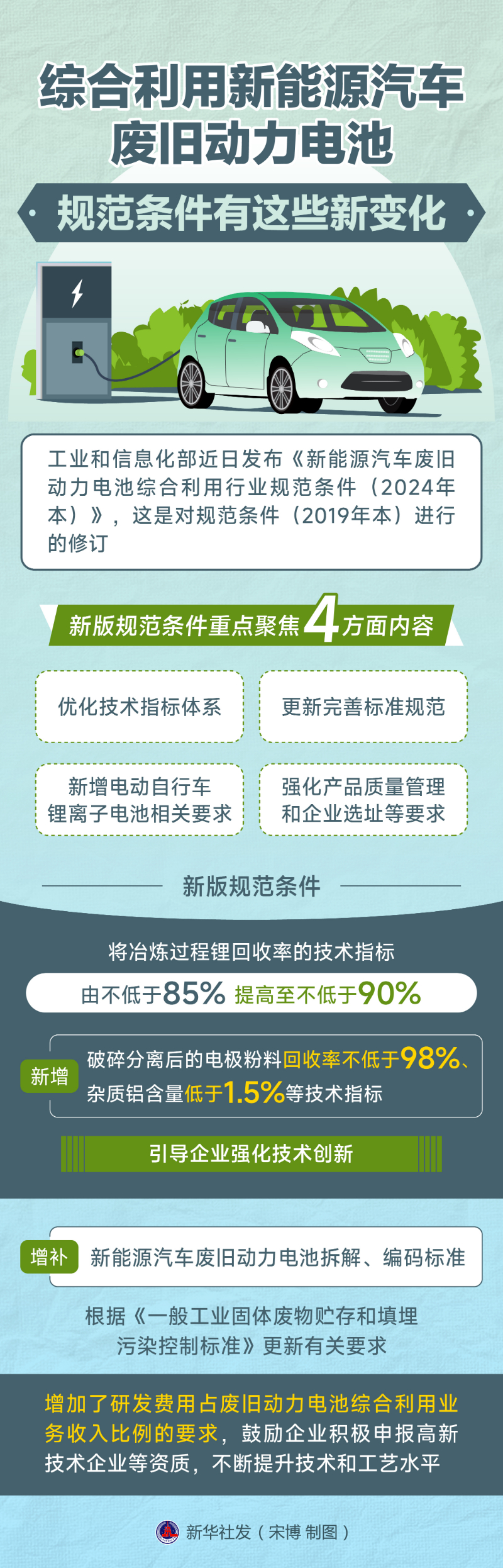 工业和信息化部近日发布《新能源汽车废旧动力电池综合利用行业规范条件(2024年本)》,这是对规范条件(2019年本)进行的修订,更好适应技术水平提升、技术指标提高的行业发展趋势,引导企业有序投资、有序发展,进一步加强新能源汽车废旧动力电池综合利用行业管理。