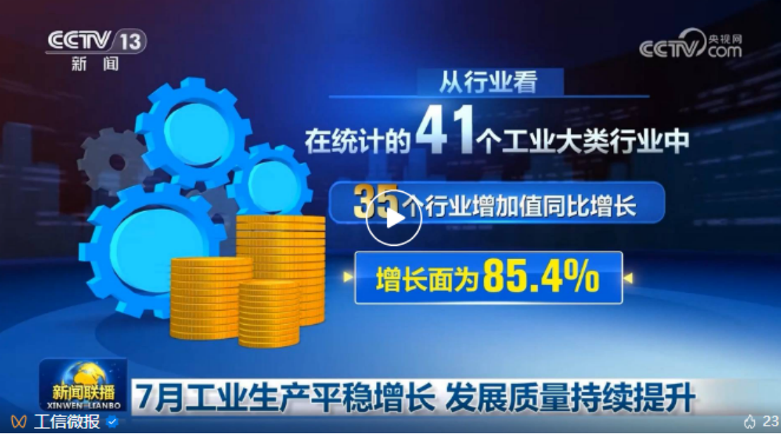 7月份,我国工业生产总体保持平稳,多数行业、产品实现增长,装备制造业支撑有力,工业经济高质量发展稳步推进。