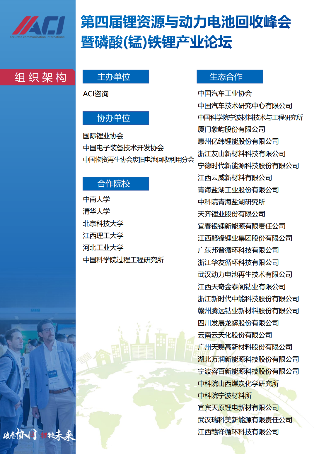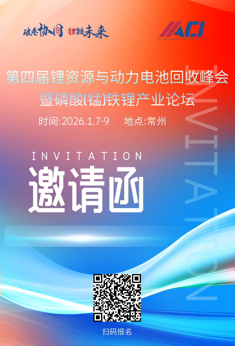 中国电子装备技术开发协会作为此次会议的协办方,联合 ACI 咨询、国际锂业协会等单位,共同组织举办“第四届锂资源与动力电池回收峰会暨磷酸(锰)铁锂产业论坛”。会议定于 2026 年 1 月 7 日至 9 日举行。具体会议详情如下,敬请关注!