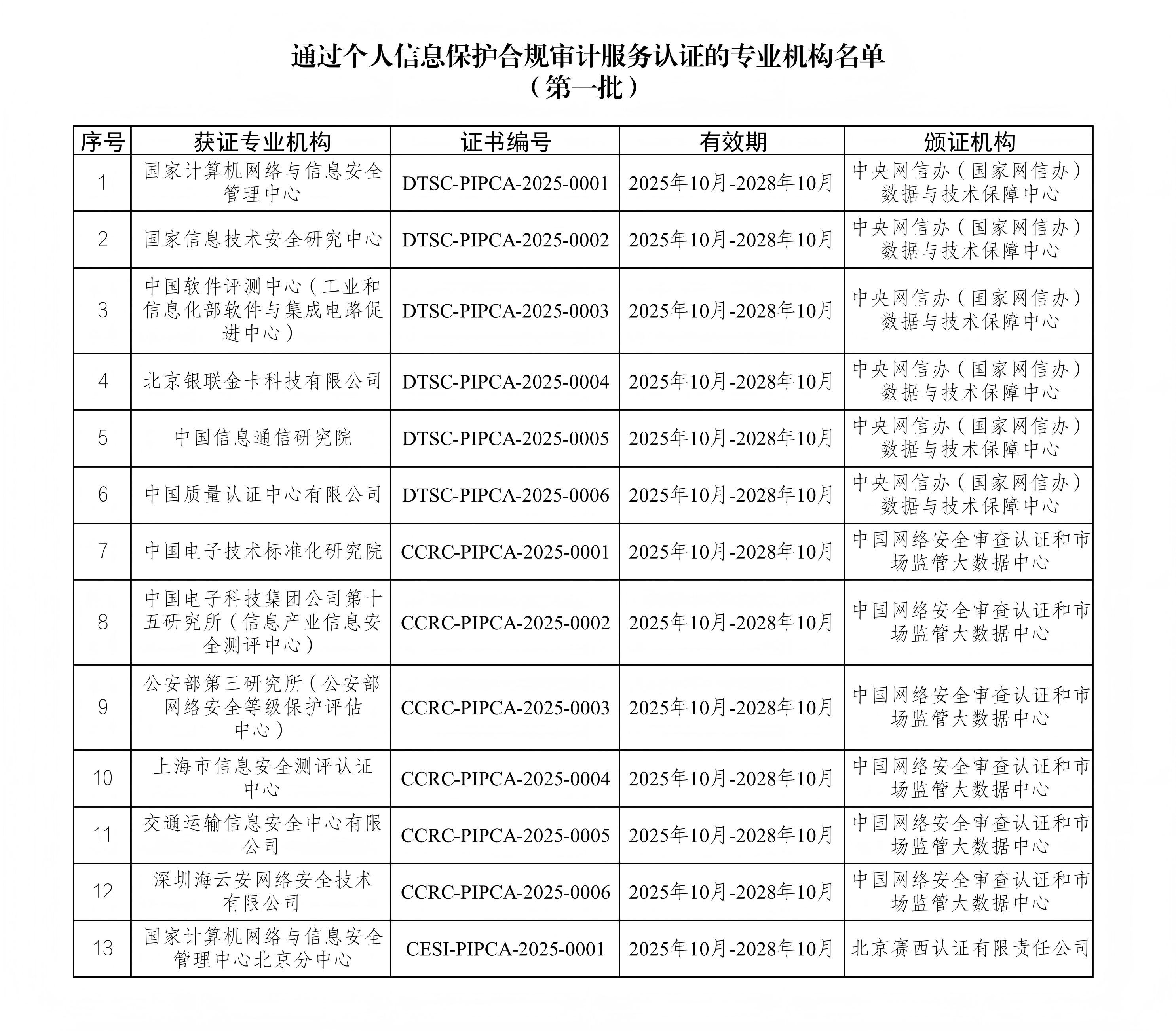 中央网信办公布:通过个人信息保护合规审计服务认证的专业机构名单(第一批)