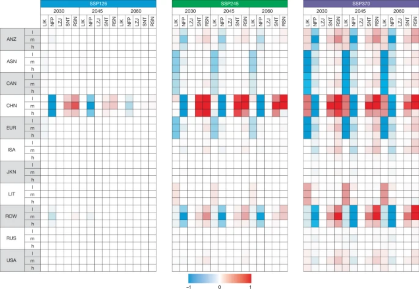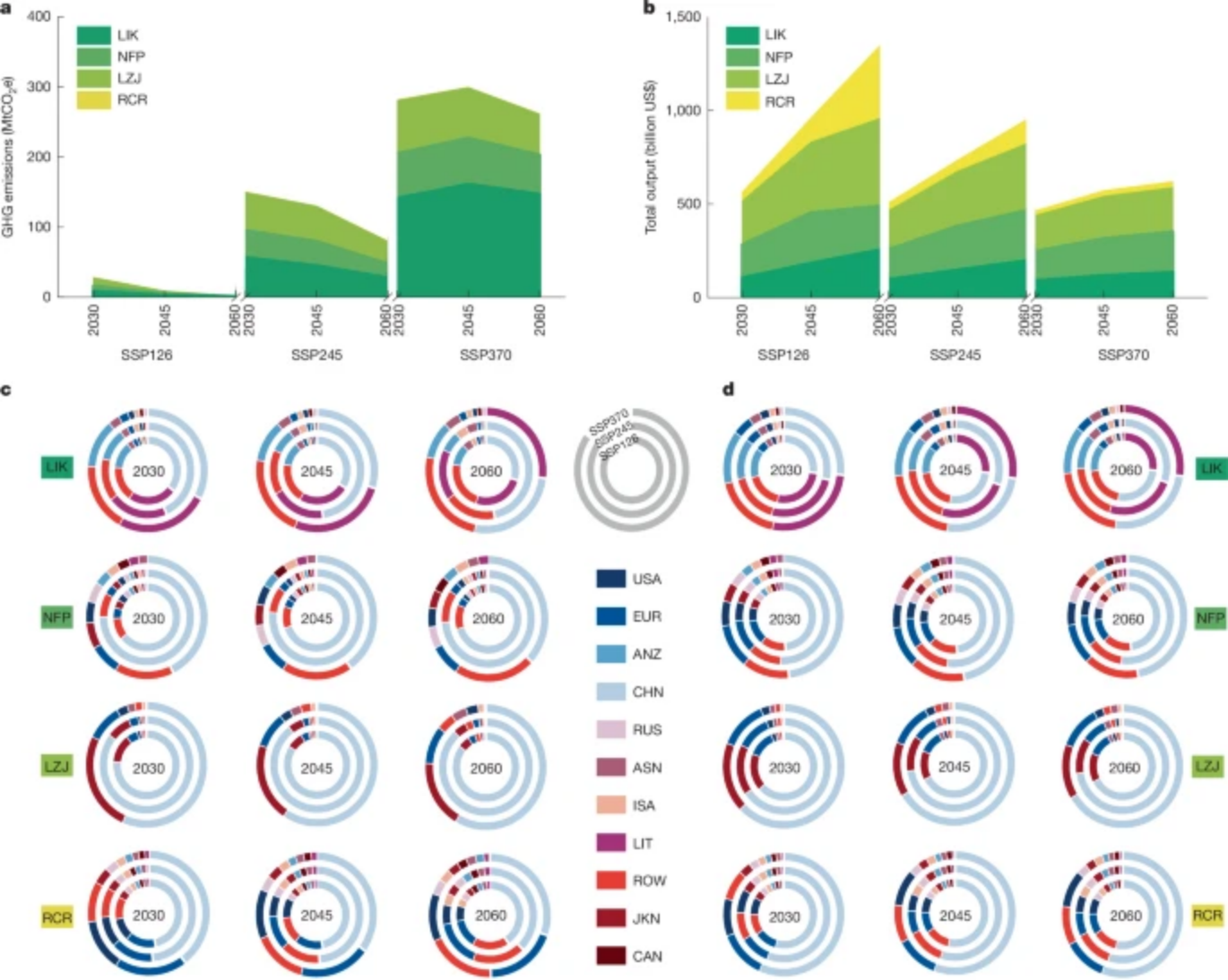 基于此工具,研究者构建了多层次情景分析:确立三种基准社会经济路径(SSPs),引入不同回收强度,探索四类区域协调模式,并综合这些维度生成1,036条路径,将环境、技术与贸易政策在单一区域及跨区域层面系统集成,以识别高度不确定性下稳健的脱碳路径。