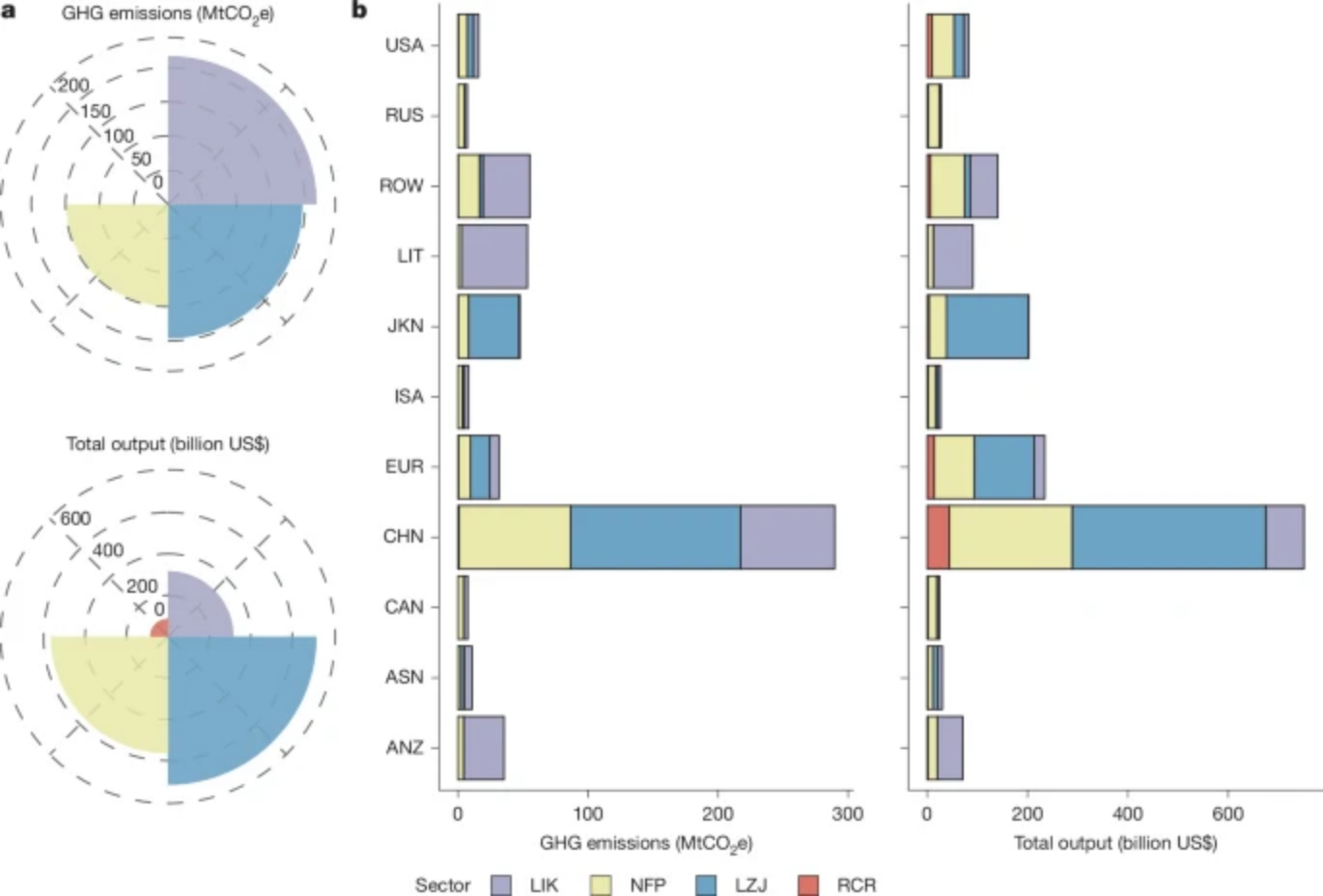 图1 全球锂离子电池供应链累计温室气体排放与经济产出。