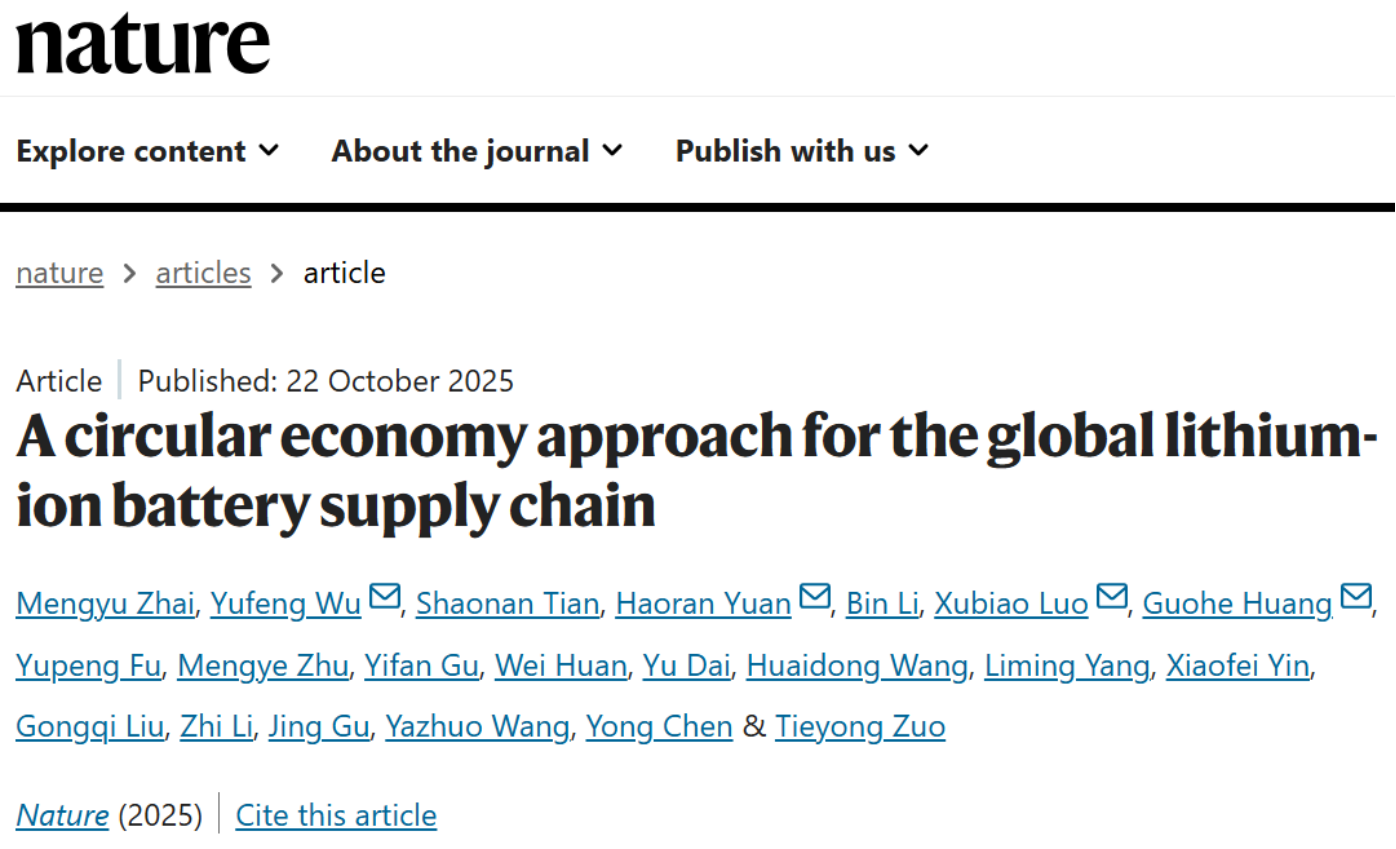 Zhai, M., Wu, Y., Tian, S.et al. A circular economy approach for the global lithium-ion battery supply chain. Nature (2025). https://doi.org/10.1038/s41586-025-09617-4