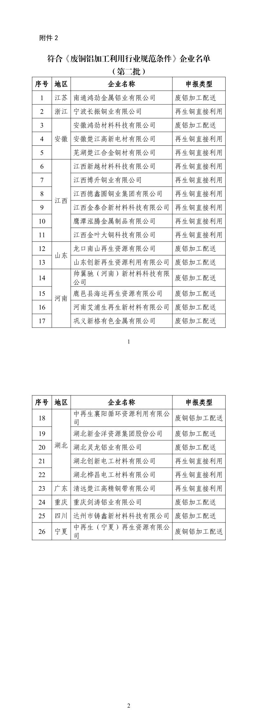 2. 符合《废铜铝加工利用行业规范条件》企业名单(第二批)