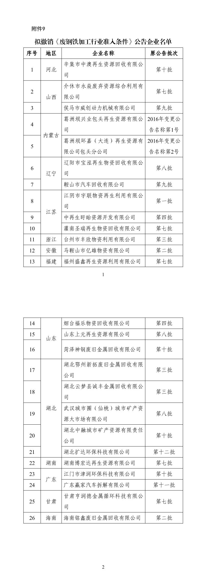 9. 拟撤销《废钢铁加工行业准入条件》公告企业名单