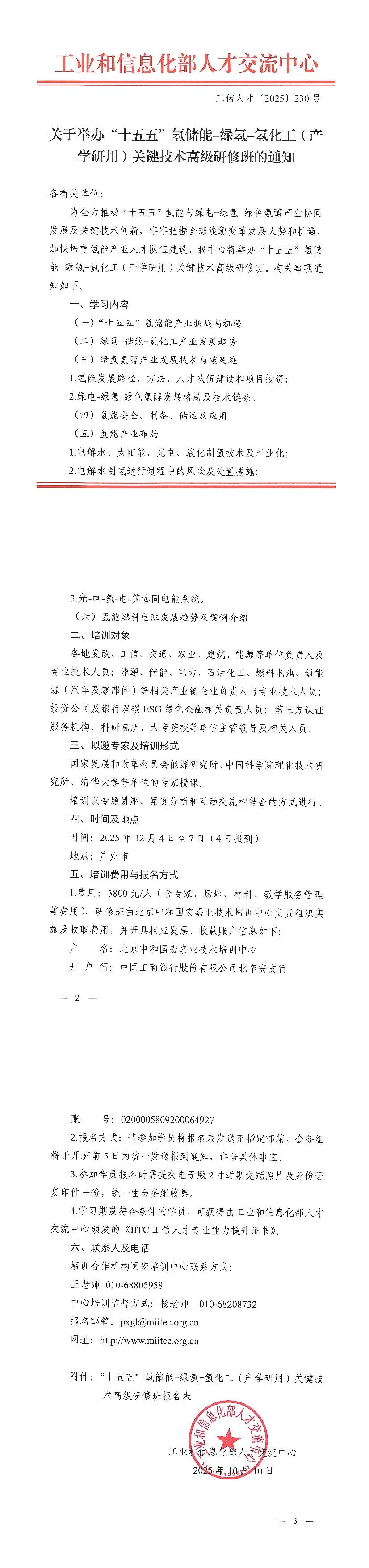 工业和信息化部人才交流中心:关于举办“十五五”氢储能-绿氢-氢化工(产学研用)关键技术高级研修班的通知