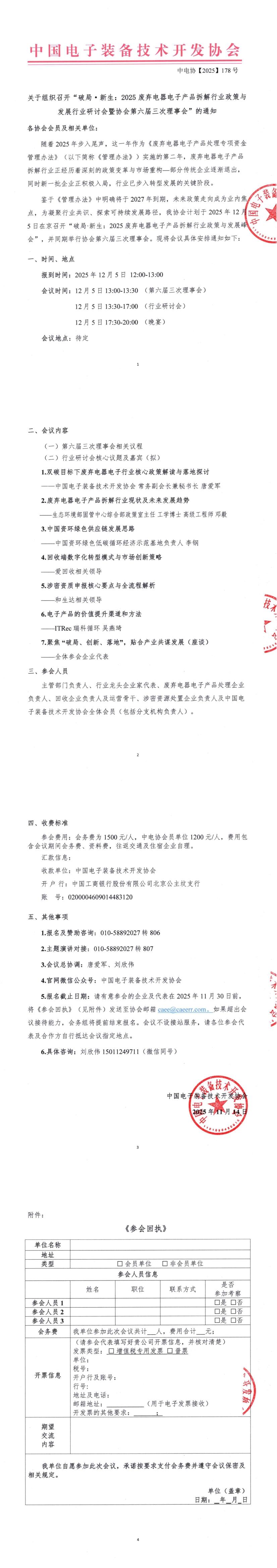鉴于《管理办法》中明确将于2027年到期,未来政策走向成为业内焦点,为凝聚行业共识、探索可持续发展路径,我协会计划于2025年12月5日在京召开“破局·新生:2025废弃电器电子产品拆解行业政策与发展峰会”,并同期举行协会第六届三次理事会。现将会议具体安排通知如下: