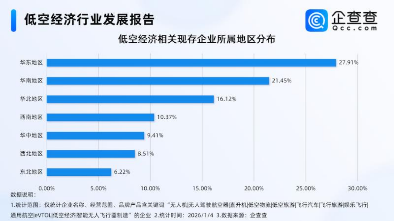 从分布区域来看,国内现存低空经济相关企业15.94万家,主要分布在华东地区、华南地区,分别占比27.91%、21.45%。其次为分布在华北地区、西南地区的相关企业,占比均在10%—20%之间。