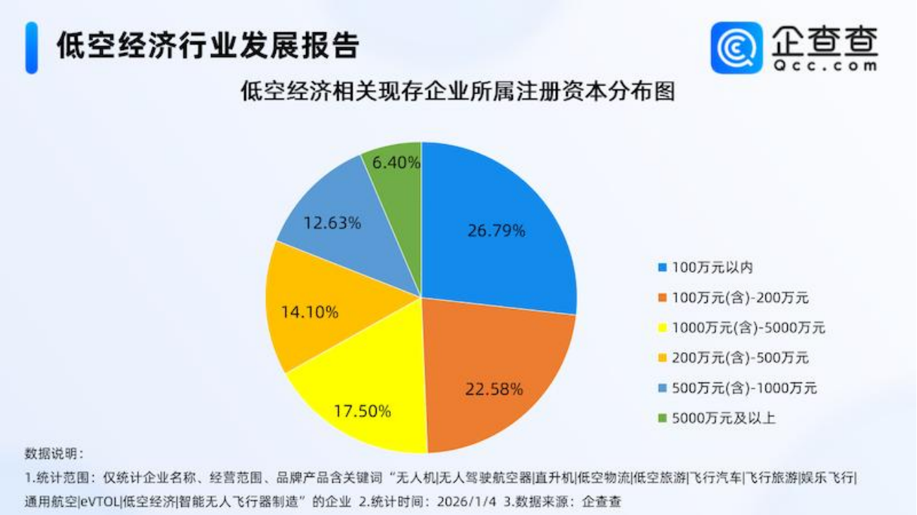 企查查数据显示,截至2026年1月4日,国内现存低空经济相关企业15.94万家,主要分布在华东地区、华南地区,分别占比27.91%、21.45%。注册资本上,近五成相关企业注册资本在200万元以下。注册量方面,2023年以来低空经济相关企业注册量呈逐年增长趋势,2025年注册量同比增长142.26%至4.9万家,达近十年来注册量及增速双高峰。