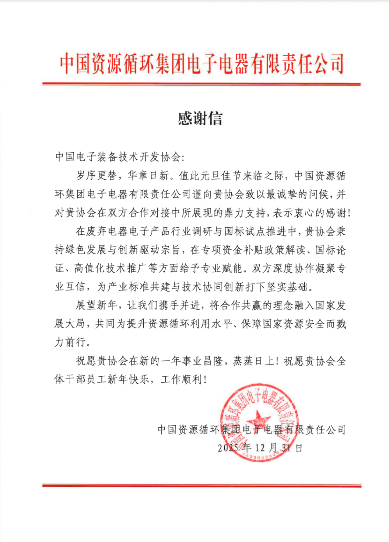 我协会接连收到中国资源循环集团电子电器有限责任公司、中国资源循环集团绿色投资有限公司发来的感谢信,对协会在合作过程中提供的专业支持与优质服务表达诚挚谢意,高度认可协会在资源循环产业发展中发挥的关键支撑作用。