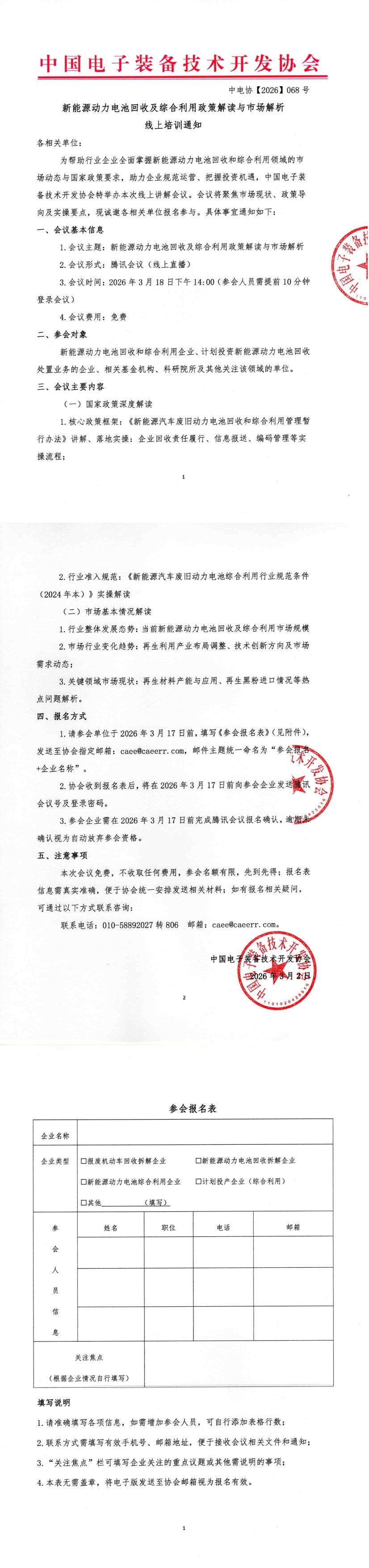 为帮助行业企业全面掌握新能源动力电池回收和综合利用领域的市场动态与国家政策要求,助力企业规范运营、把握投资机遇,中国电子装备技术开发协会特举办本次线上讲解会议。会议将聚焦市场现状、政策导向及实操要点,现诚邀各相关单位报名参与。具体事宜通知如下: