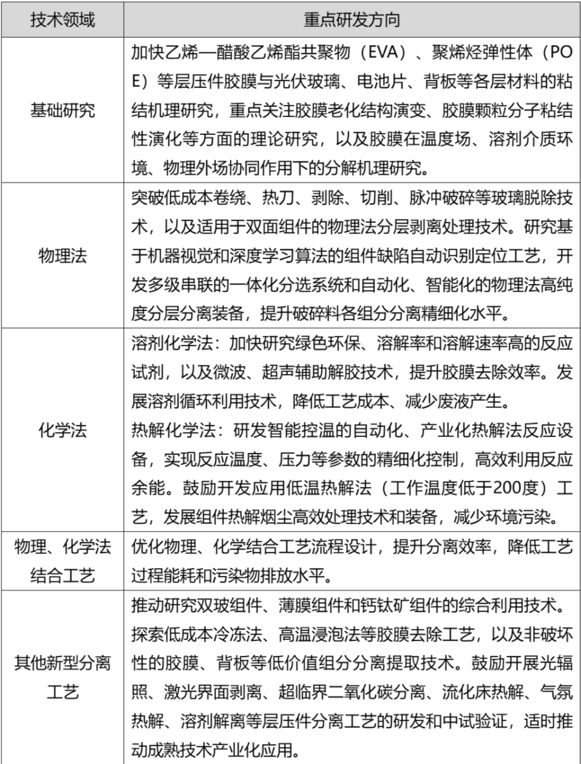 (二)突破高效分离工艺。开展光伏组件胶膜粘结机理研究,丰富完善胶膜低成本解离技术理论体系。加快研发晶硅单玻、双玻等组件的物理法、化学法、结合工艺及新型分离工艺,攻克光伏组件部件与胶膜的绿色、高效分离技术,鼓励开发非破坏性拆解技术,探索完整玻璃等材料获取路径。详见附件《高效分离工艺重点研发方向》。(工业和信息化部、生态环境部按职责分工负责)