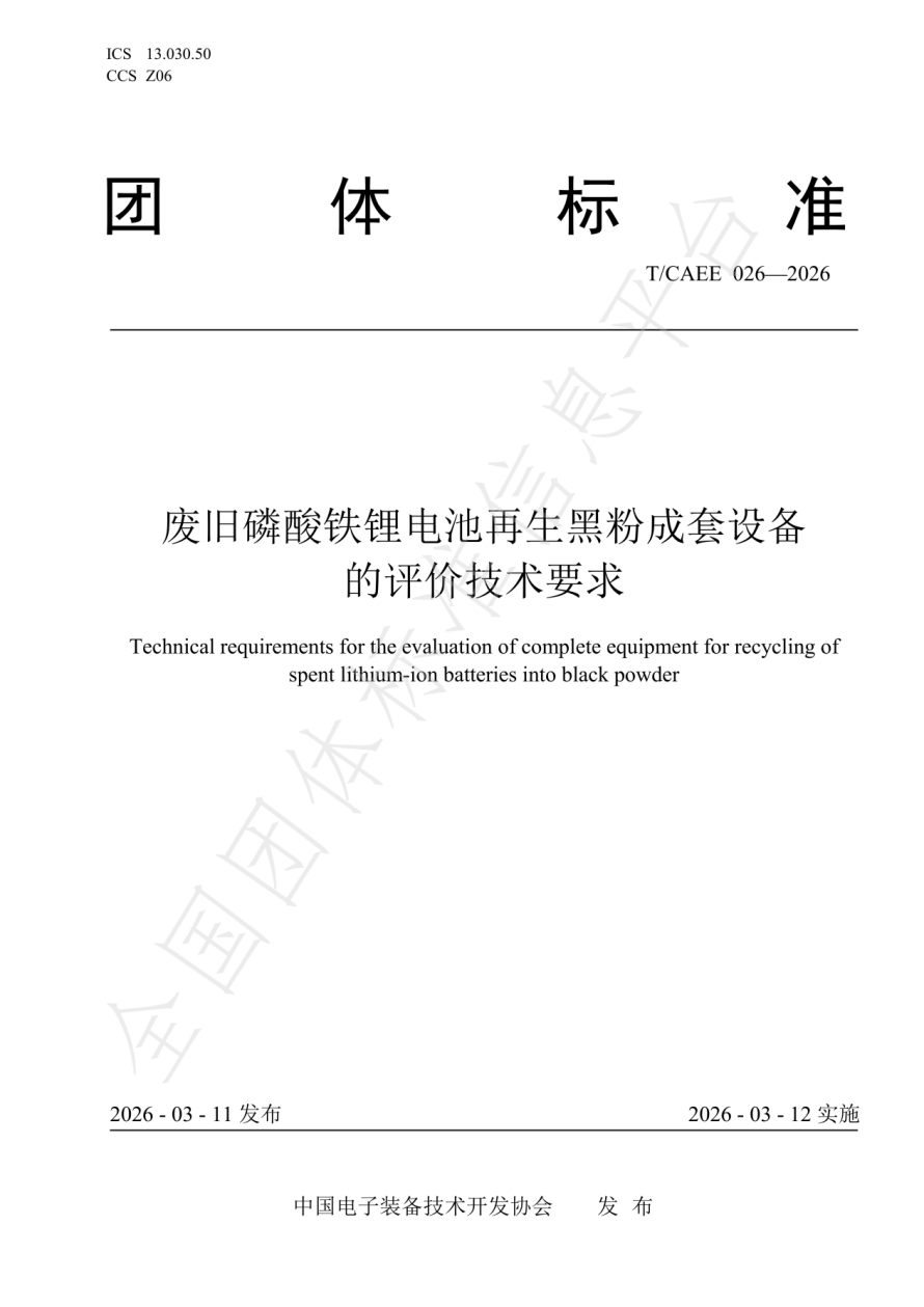 《废旧磷酸铁锂电池再生黑粉成套设备的评价技术要求》聚焦废旧磷酸铁锂电池再生黑粉成套装备的运行效果,明确了该类设备的专项评价要求,确立安全环保否决、分类工况评价、系统完整性三大核心原则,评价范围全面覆盖从放电预处理到尾气废水处理的设备完整运行系统,实现全流程、全环节的性能考核。