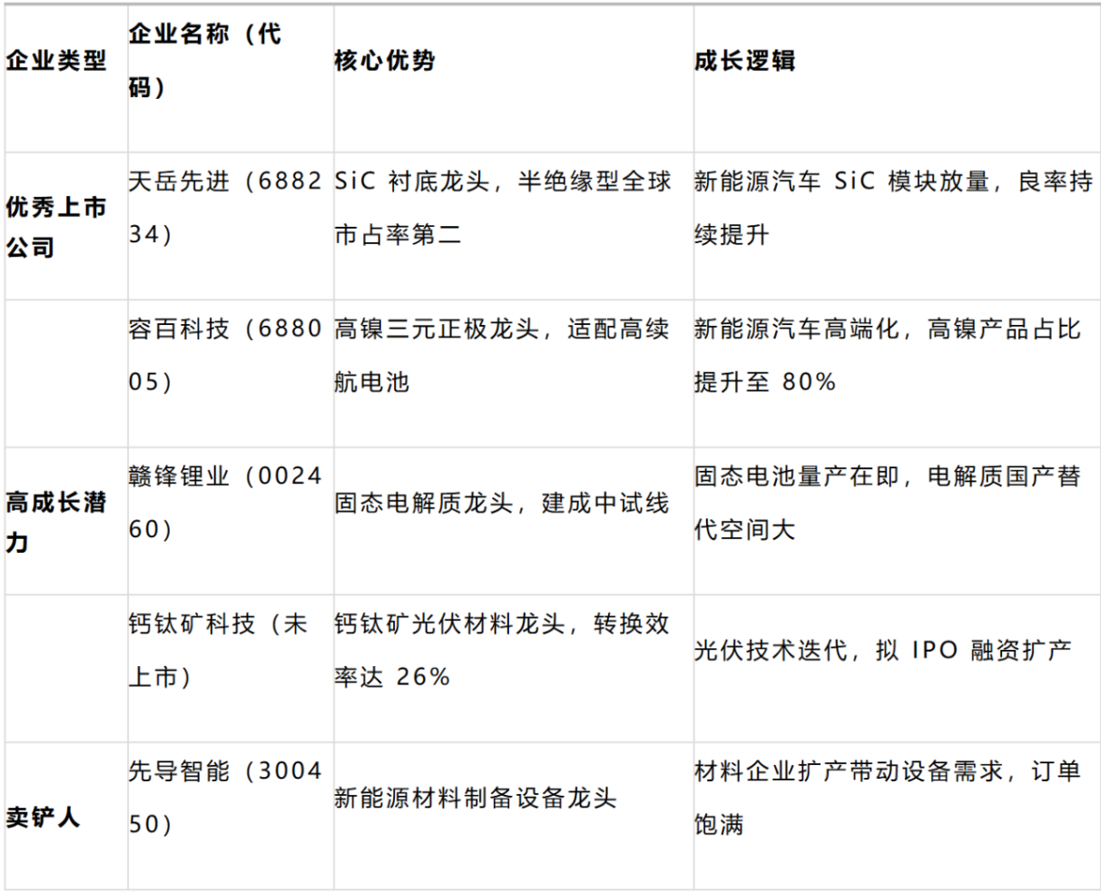 1.核心突破SiC/GaN 第三代半导体衬底、高镍三元正极、固态电解质、钙钛矿光伏材料、氢能储氢材料。