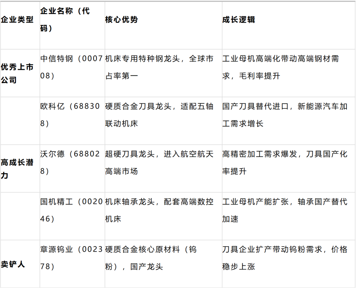 (3)工业母机配套材料:高端轴承钢、硬质合金刀具国产化率 **<10%,精度与寿命差距3-5 倍 。